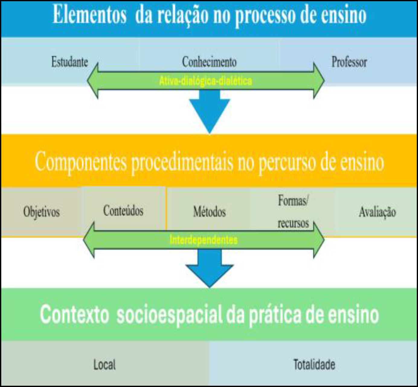 Para que isso realmente se efetive, a Didática da Geografia precisa, além do domínio epistêmico da Geografia (categorias, conceitos, princípios e linguagens), envolver um conjunto de componentes didático-pedagógicos, entre eles, os da presente delimitação do objeto de pesquisa deste trabalho, a saber: elementos da relação dos sujeitos com o conhecimento (estudante, conhecimento, professor), os componentes procedimentais operativos para os percursos didáticos das aulas de Geografia (objetivos, conteúdos, métodos, formas organizativas, recursos e avaliação), sem se esquecer de situá-los nos contextos situacional local e da totalidade em movimento (Figura 1).