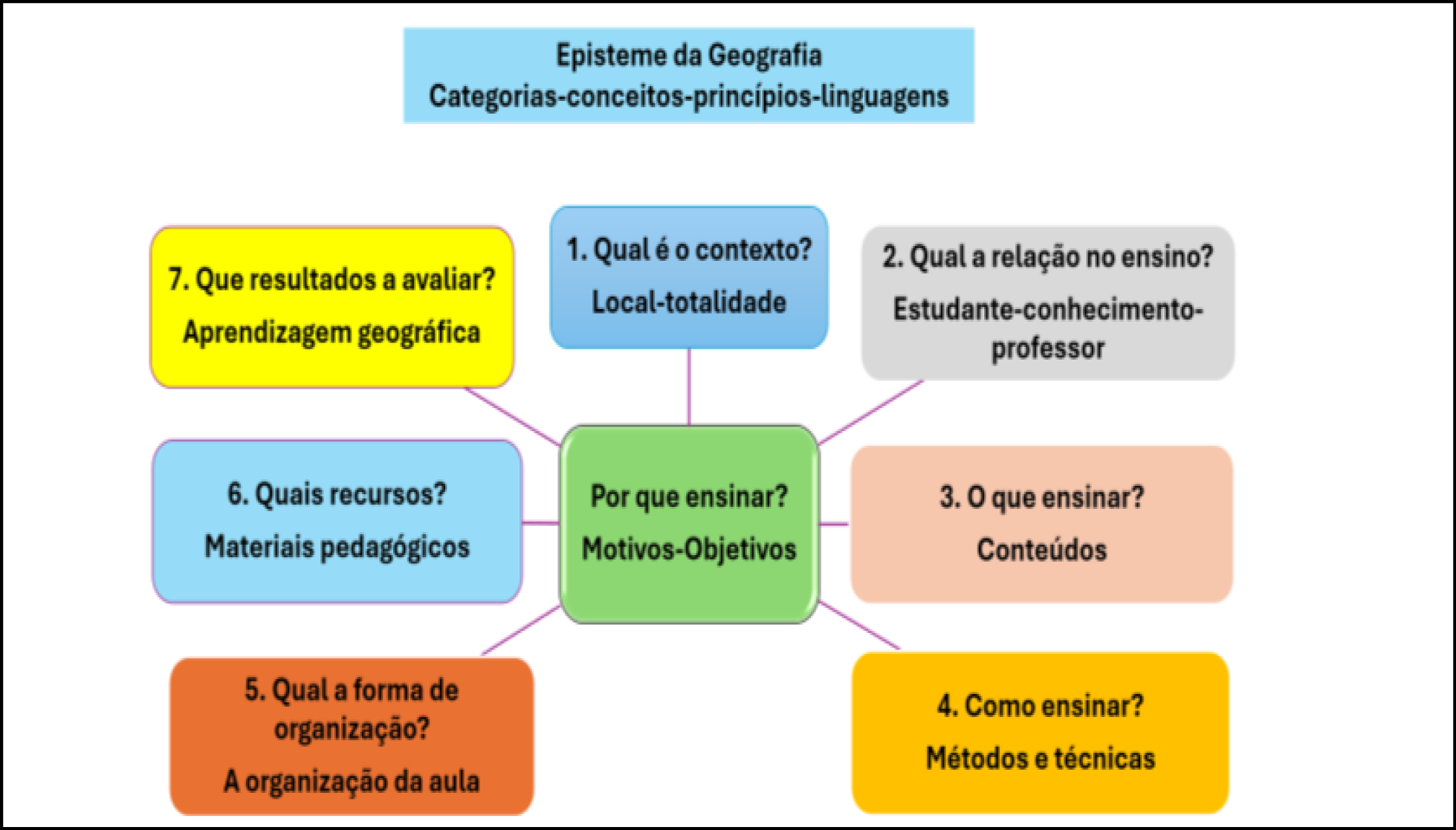 A Didática da Geografia, portanto, cria, organiza e orienta condições para os processos de ensino e aprendizagem de Geografia no que diz respeito ao papel do ensino de Geografia para as sociedades, dos professores e dos estudantes, dos conteúdos veiculados nas escolas, bem como sobre quais caminhos para se ensinar a fim de potencializar a aprendizagem geográfica (Cavalcanti, 2024). Nesse viés, a autora argumenta que a didática contribui tanto para a formação docente quanto para a formulação de teorias, proporcionando instrumentos práticos e teóricos sobre as práticas educativas.