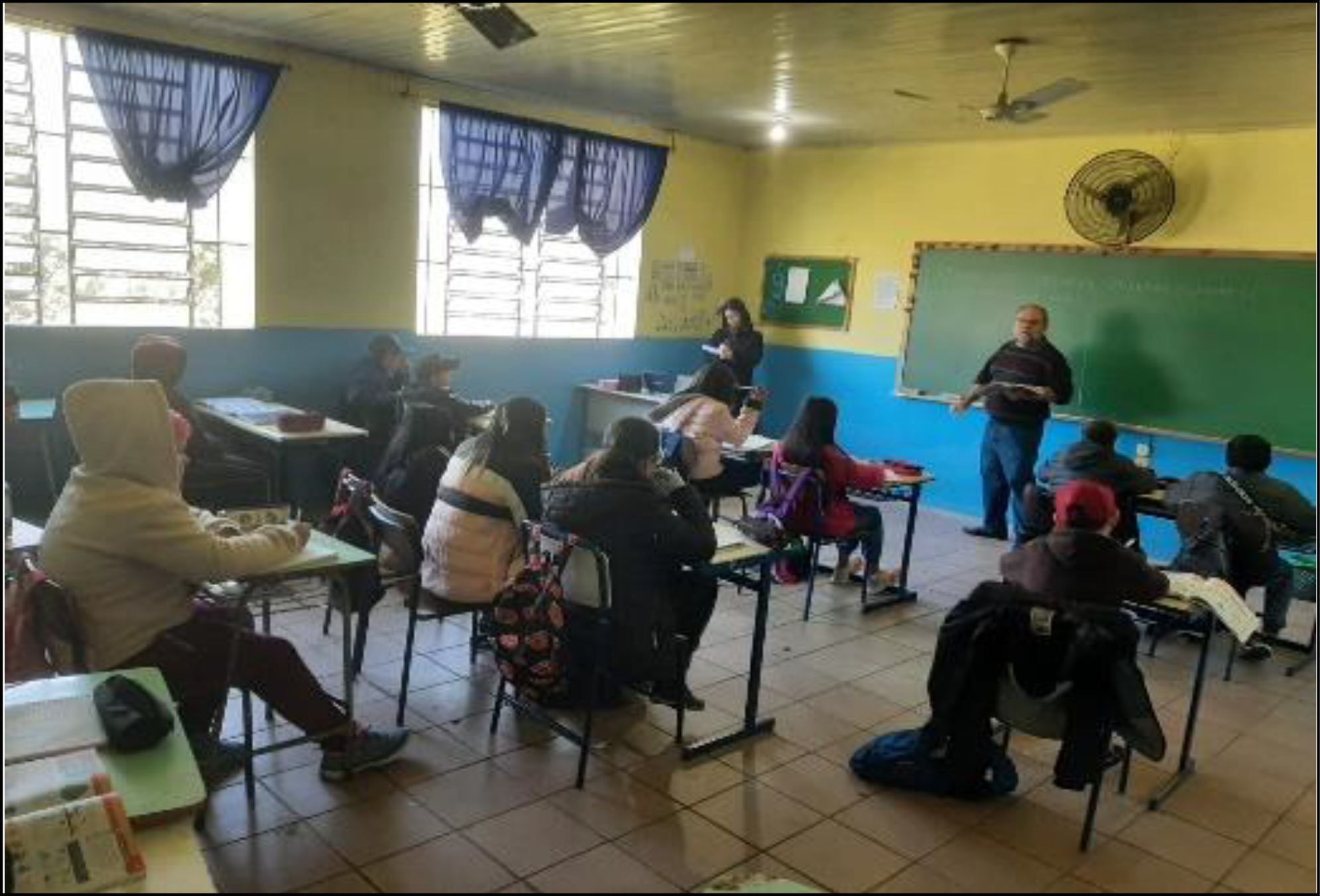 A primeira atividade foi executada na EMEF Profa. Cândida Zasso, de Nova Palma, em julho de 2023, com uma turma do 8º ano e teve duração de dois períodos. Foi desenvolvido o tema de migrações na América Latina. Com base nos textos do material didático utilizado pela escola - o livro “Expedições geográficas” de Sérgio e Melhem Adas, foi realizada uma breve contextualização da migração das populações pelo espaço geográfico, abordando alguns motivos causadores deste processo, bem como o fato das pessoas trazerem seus contextos culturais e sociais nos movimentos de deslocamento e chegada em novos lugares. Nesse momento foi realizado o diálogo com os alunos referente aos processos de imigração de seus familiares, alguns identificando a vinda de europeus no século XIX, dentre eles os oriundos do atual território italiano que formaram os núcleos coloniais e, posteriormente, originaram o próprio município de Nova Palma.