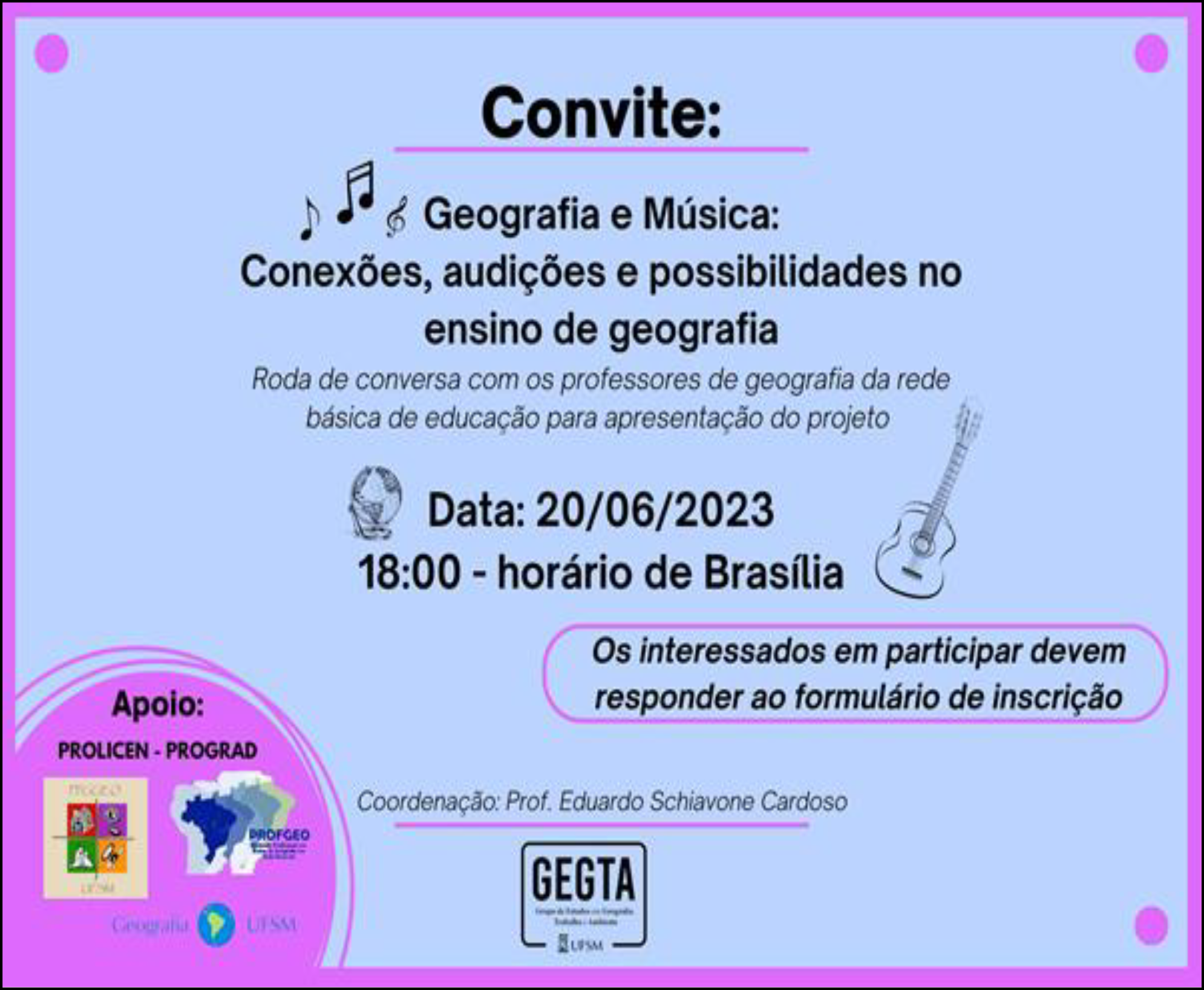 Uma segunda oficina, intitulada “Acordes nas Terças” e destinada aos graduandos em Geografia da UFSM, foi realizada de forma presencial nos auditórios da universidade. Com duração de três tardes de terças-feiras - dias 5, 12 e 19 de setembro de 2023, tiveram como finalidade contribuir na formação dos discentes, apresentando experiências e práticas de ensino e pesquisa que conectam música e Geografia, bem como refletir, conhecer e produzir possibilidades de atividades didáticas.