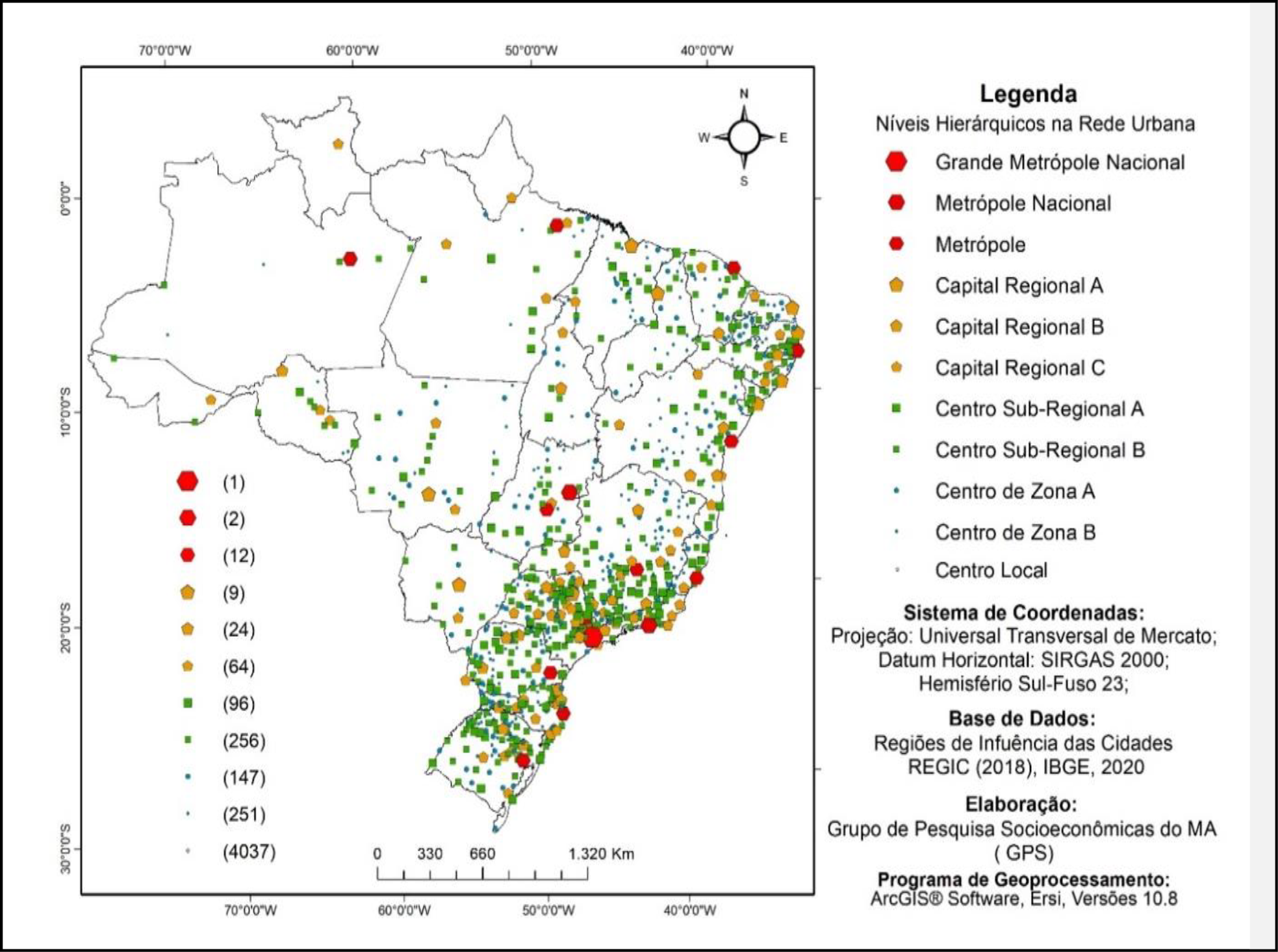 Diante desse escopo, a rede urbana brasileira compreende um conjunto de centros urbanos que polarizam o território e são de extrema importância para a dinâmica espacial, sobretudo para o desenvolvimento nacional e regional. O processo de desenvolvimento desse composto de redes e conjuntos urbanos revela níveis de integração produtiva e econômica entre as regiões IBGE (2000, 2008, 2020). Essa rede é classificada e estruturada em cinco níveis hierárquicos: Metrópole, Capital Regional, Centro Sub-Regional, Centro de Zona e Centro Local.