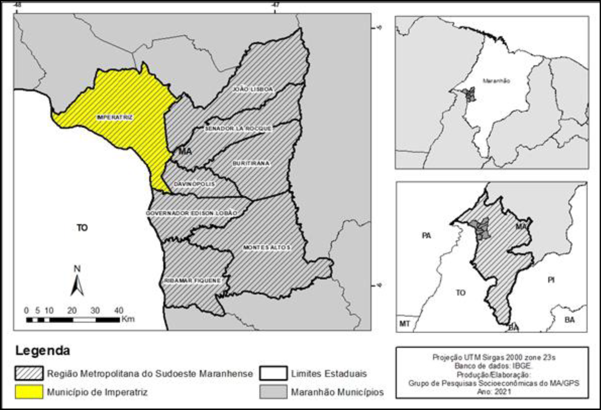 Desta forma, no ano de 2005, o Estado do Maranhão estabeleceu as discussões para a criação de sua primeira região metropolitana fora da área limítrofe da capital, São Luís. A Região Metropolitana do Sudoeste Maranhense (RMSM) foi criada por meio da Lei Complementar Estadual do Maranhão n.º 89, de 17 de novembro de 2005, sendo definida como uma “[…] unidade organizacional geoeconômica, social e cultural, constituída […]” Maranhão (2005, p. 1), inicialmente, pelo agrupamento de oito municípios, quais sejam: Imperatriz, João Lisboa, Senador La Rocque, Buritirana, Davinópolis, Governador Edison Lobão, Montes Altos e Ribamar Fiquene.
