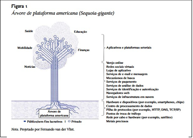 O processo de plataformização da educação púbica paulista insere-se no terceiro espaço do corpo da Árvore da Plataformização, elaborada por José van Dijck, o dos galhos e folhas. Segundo a pesquisadora holandesa (2014, 2016), de modo sucinto, no nível das raízes, detecta-se o processo sociocultural profundo e transformador da Dataficação como solo invisível que nutre todo o sistema. Nele estão a materialidade de aparatos - privados (em sua maioria) e públicos - que permitem a computação na nuvem (por exemplo, datas centers, protocolos de internet, cabos de rede, satélites, e outros hardwares, minérios e metais raros, dispositivos como chips, smartphones).