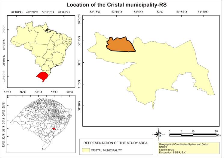 Cristal is a municipality located in the south of the Rio Grande do Sul State and it is considered small according to the classification of the Brazilian Institute of Geography and Statistics (IBGE, 2016). It has a territorial unit area of 681,625 km², with an estimated population of 7,792 inhabitants, predominantly urban, although it is important to consider that the local economy is based on rural production.