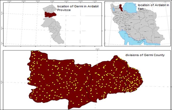 2 Material and methods2.1 The situation of case study boundaryGermi is bounded from north to Bileh Savar and Parsabad from north, to Kaleybar and Ahar from west (East Azerbaijan), to Meshgin Shar from south and to Azerbaijan Republic- Jalilababd and Yardimli from east. It is bounded to Salavat mountains from south, to Khoroslou mountains from north, to Darehroud river from west and to Balehrod from east. Based on administrative division, Moghan is 2049 km2 (figure 2). Figure 2 - The situation of case study boundary