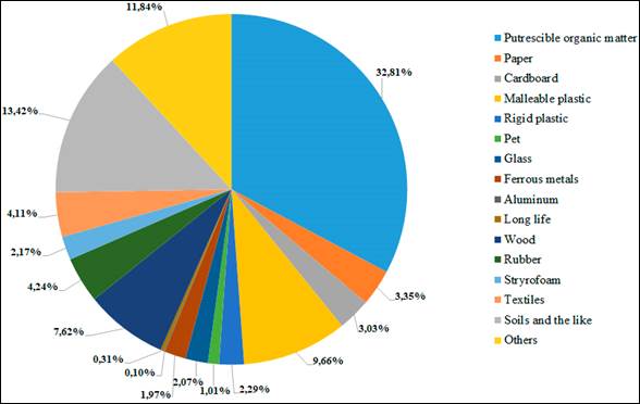 Were considered as fractions of residues for the study: Putrescible organic matter: food and animal or vegetable waste; Paper; Cardboard; Malleable plastic: plastic bags and films; Rigid plastic: sturdier plastic utensils; Pet: containers or bottles of water, sodas, juices and cleaning products; Glass; Ferrous metals: Identified by a magnet; Aluminum: beverage, food and kitchenware cans; Long life: packaging with layers of paper, metals and plastics; Wood; Rubber; Stryrofoam; Textiles; Soils and the like: public cleaning waste; Others: waste without the possibility of separation or identification.