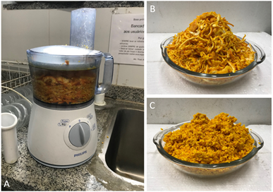 Figure 1 - Crushing the substrate. A) Food multiprocessor; B) Sliced peel; C) Crushed peel.