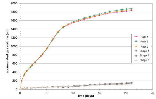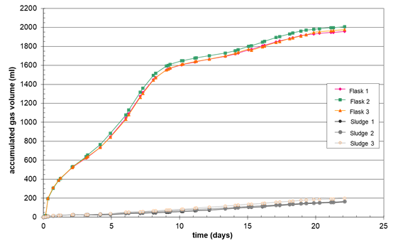 In the first days the activity is intense, with a great slope of the curve that, over time, becomes softer from the tenth day, indicating the reduction of microbial activity in the generation of gas, which finally stabilizes around the twentieth day with little gas generation. Flasks 4, 5 and 6, in other words, flasks with only anaerobic sludge, were used as blank solutions, that is, to show how much biogas is generated only by the sludge and not by the substrate.