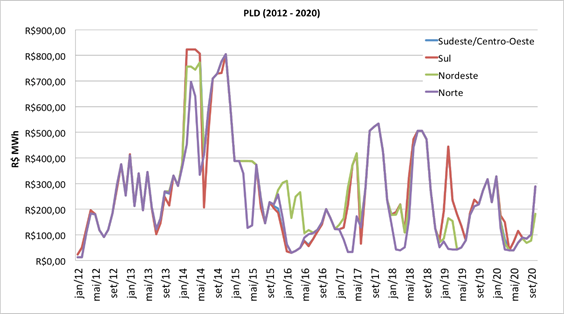 When analyzing the historical series of the PLD of the Southeast/Central-West, South, Northeast and North submarkets (Figure 1) between the period from January 2012 to September 2020, it is observed that the beginning of the decade was marked by a period of low price behavior followed by an increase in the following years. It is noted that prices are inconstant, with records of high prices, such as in the period between February and May 2014, when prices reached the mark of 822.83 R$/MWh and between August and November of the same year, when they reached prices between 709.53 to 804.54 R$/MWh. In 2017, the PLD rose again, however, in this period it did not exceed the 533.82 R$/MWh mark.
