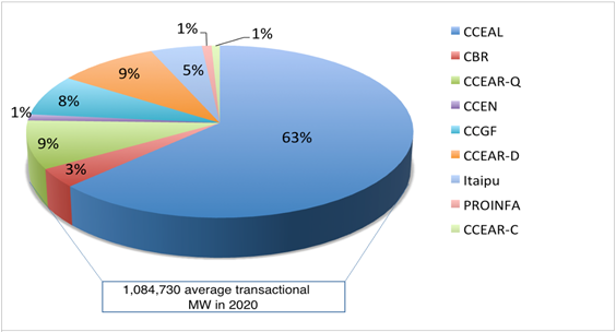 Note in Figure 2 that 63% of the contracted energy was negotiated through electricity commercialization contracts in the free environment (CCEAL), followed by quantity contracts (CCEAR-Q) and availability contracts (CCEAR-D).