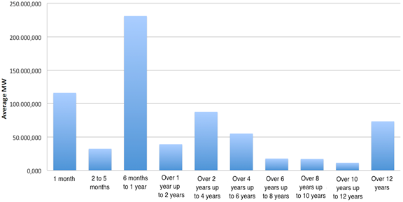 The purchase contracts considered in the CCEAL were executed by Independent Producers, Auto-producers, Generators, Retailers, Free and Special Consumers and Distributors, representing a seasonalized volume of 110,293.68 average MW. Figure 3 presents the contracted amount in average MW and the duration of the contracts. Note that the contracted amount is higher in the 6 month to 1-year period, followed by 1-month contracts.