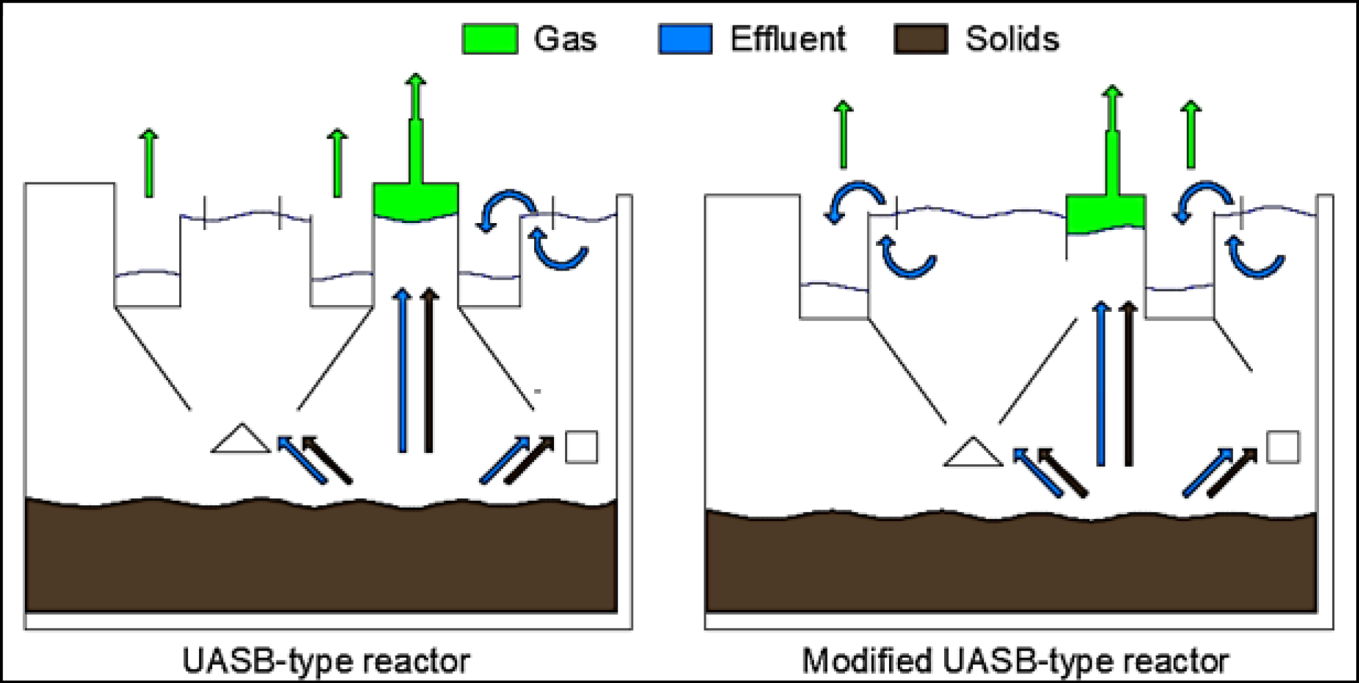 Figure 1 – Schematic representation of a traditional UASB-type reactor and a modified UASB-type reactor