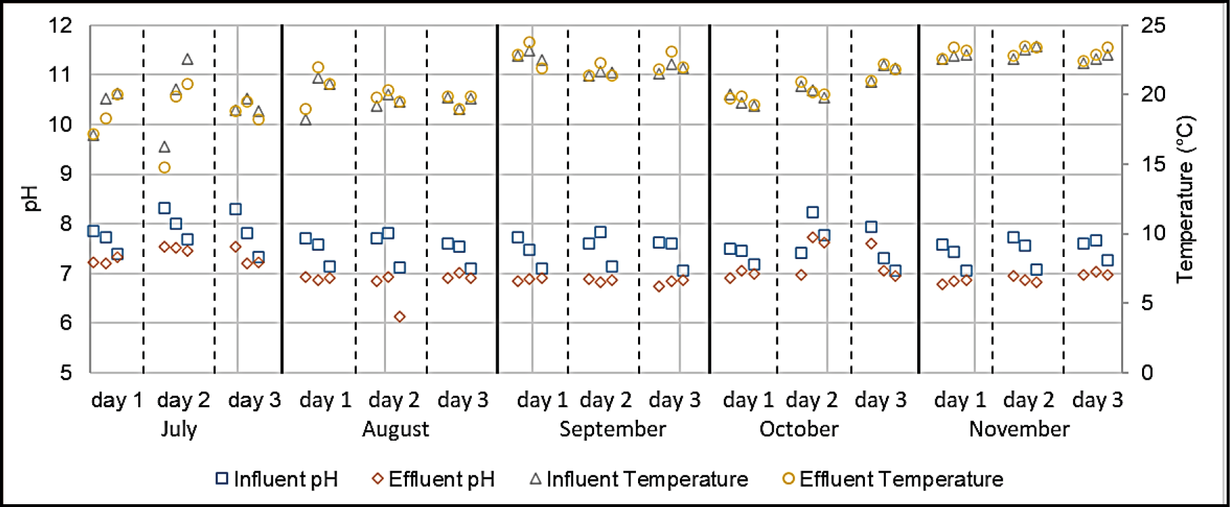 Depending on the temperature at which it occurs, anaerobic digestion can be psychrophilic (< 20 °C), mesophilic (20-45 °C), or thermophilic (45-60 °C), with anaerobic digesters usually operated in these last two ranges (Safley Jr and Westerman, 1992, Suryawanshi, Chaudhari, Kothari, 2010). The operational temperature ranged from 16.3 to 23.5°C, with an average of 20.9 ± 1.7°C. The reactor operated in the psychrophilic range for approximately one-third of the time, and in the mesophilic range for the remainder. The lower temperatures observed during the first two months can be attributed to winter conditions in the study region.