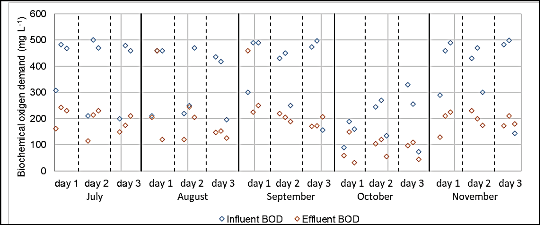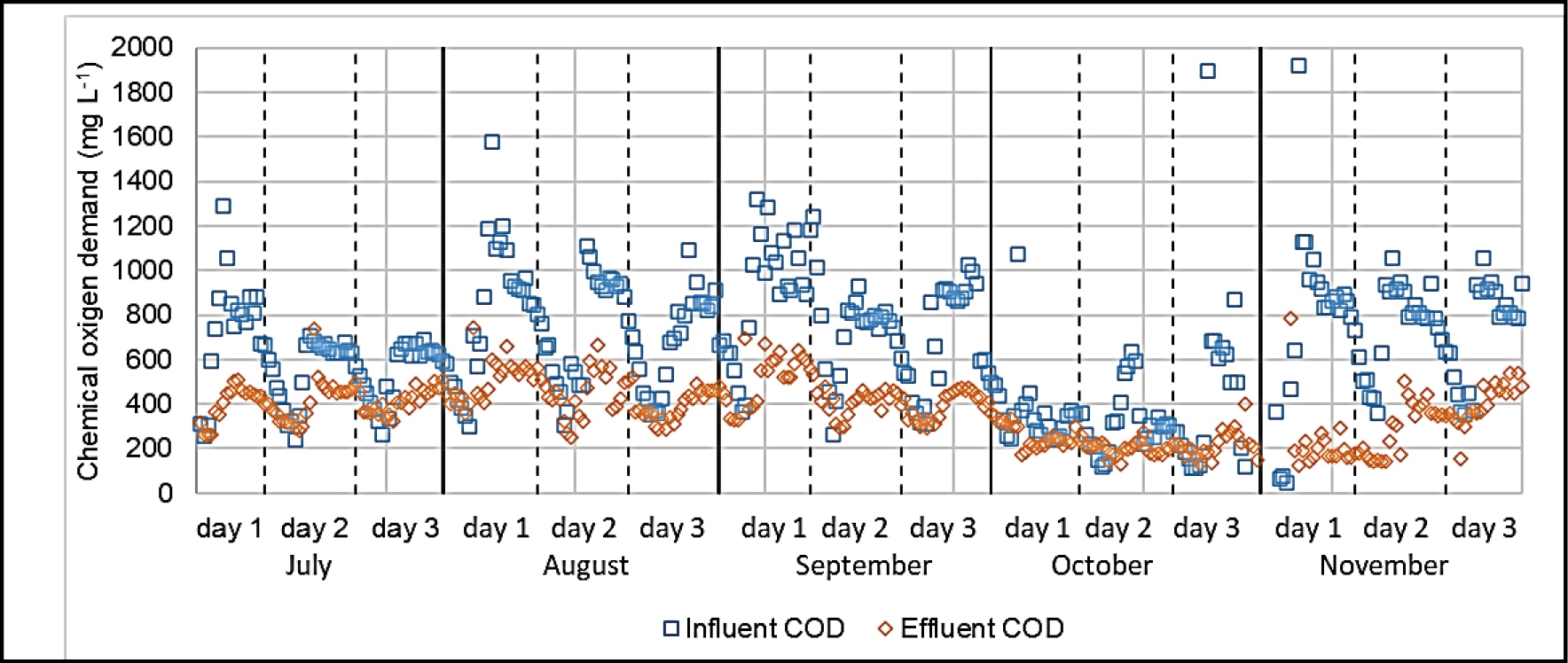 The average influent BOD was 346 ± 137 mg L-¹, while the average influent COD was 650 ± 292 mg L-¹. Due to the 24 daily COD measurements, cyclical variations were observed, with a period of approximately 24 hours. The average daily COD variation amplitude was 805 ± 388 mg L-¹. These variations explain the high standard deviation (45% of the mean) and were likely related to daily patterns in population activity, as stated by Metcalf and Eddy (1980). i.e., for a given population, sewage flow rate and composition typically vary over a day, with higher organic loads during periods of increased water use, such as mornings and evenings. In contrast, the average effluent COD was 370 ± 129 mg L-¹, with an average daily amplitude of 294 ± 193 mg L-¹. Since effluent COD showed lower variations compared to the influent, it can be inferred that the reactor effectively absorbed fluctuations in organic loading without compromising process stability. The average effluent BOD concentration was 180 ± 83 mg L-¹.