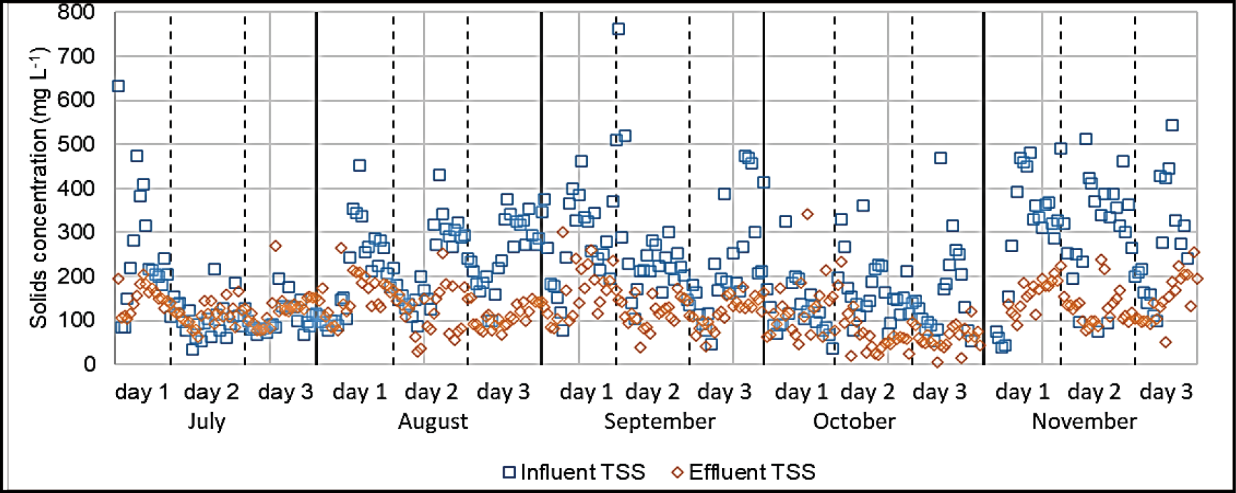 Regarding TSS, concentrations behaved similarly to COD: cyclical in the influent, with a roughly daily pattern, and more stable in the effluent. The average influent and effluent concentrations were 227 ± 196 mg L-¹ and 126 ± 53 mg L-¹, respectively. The average removal efficiency was 26 ± 54%, lower than the 54 ± 16% reported by Khan et al. (2015) and the 65–90% indicated by Crone et al. (2016) for UASB-type reactors. This reduced efficiency may be attributed to operational control routines and the current state of the infrastructure. Van Lier et al. (2010) reported that many newly built UASB reactors do not achieve satisfactory performance due to inadequate operation and insufficient monitoring. It should also be noted that efforts were made to maintain the sludge blanket height within the operational limits recommended by the sanitation company. Finally, as with COD and BOD, the structural differences between the modified UASB and traditional configurations may partially account for the lower efficiency.