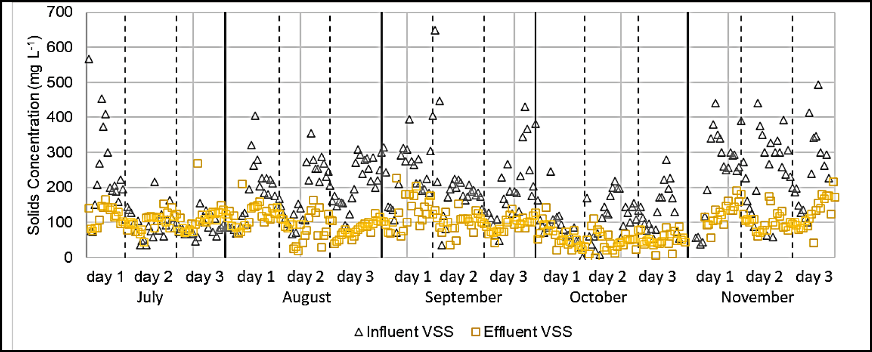 One hypothesis is that the openings in the three-phase separator of the modified UASB-type reactor may be contributing to the lower concentrations of dissolved methane. These openings may not only allow solids to escape, but also facilitate the release of biogas bubbles that may carry, aggregate, and strip dissolved methane, which then escapes into the atmosphere from the surface of the settling tank/reactor. Overall, the combination of physical, operational, and environmental factors—such as reactor configuration, limited mixing, temperature fluctuations, influent variability, and mass transfer limitations—may collectively contribute to the patterns observed in dissolved methane concentration.