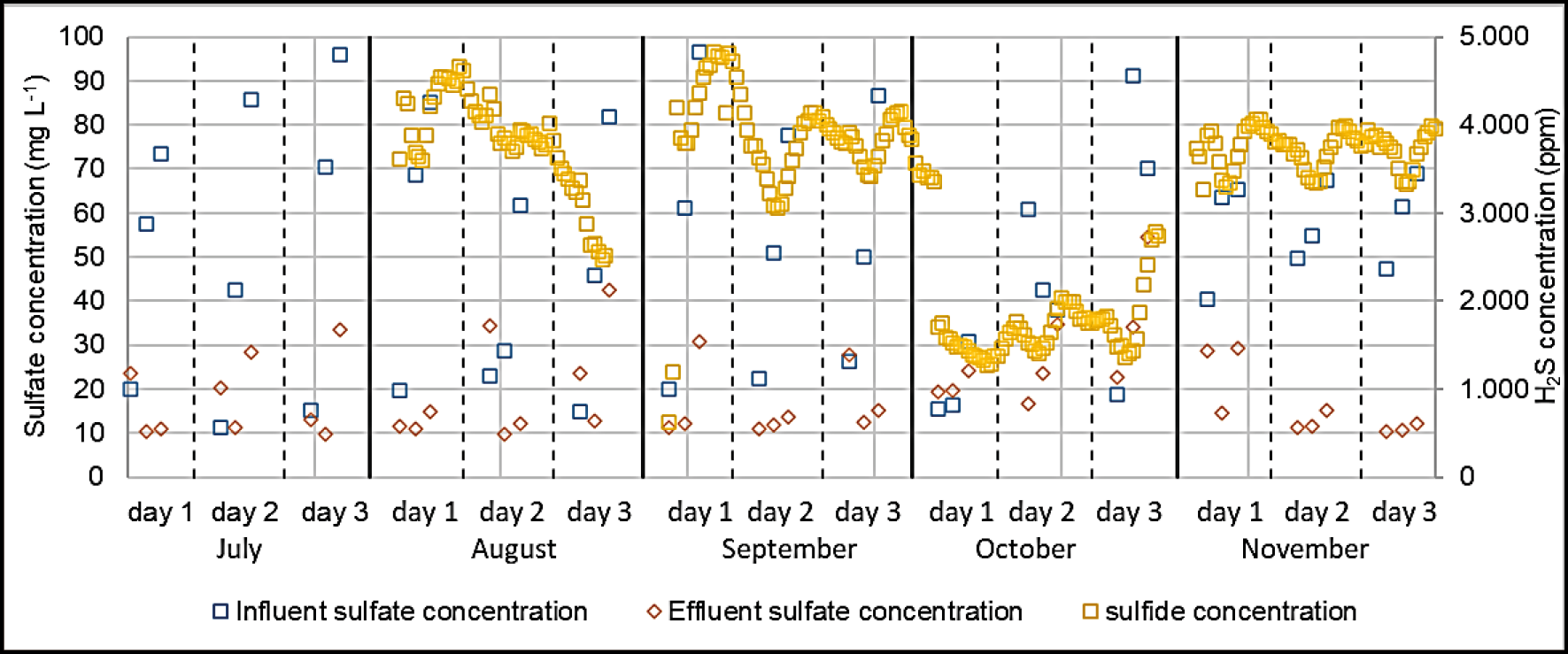 It was observed that sulfate reduction by sulfate-reducing bacteria (SRB) occurred, with an average removal efficiency of 46.5 ± 44%. It should be noted that in 18% of the samples, effluent sulfate concentrations were higher than influent values, thereby lowering the average and increasing the standard deviation. The activity of SRB is evident, as a reduction in average sulfate concentration was observed from 51.01 ± 25.31 mg L-¹ in the influent to 19.41 ± 10.27 mg L-¹ in the effluent. The reduction of sulfate to sulfide also results in the formation of hydrogen sulfide (H2S) within the reactor, which is considered one of the main odorant gases in WWTPs and is flammable, corrosive, and toxic. This occurs because sulfides, when present in the liquid phase, are easily released into the atmosphere in gaseous form (Chen et al., 2011, Zhang et al., 2013).
