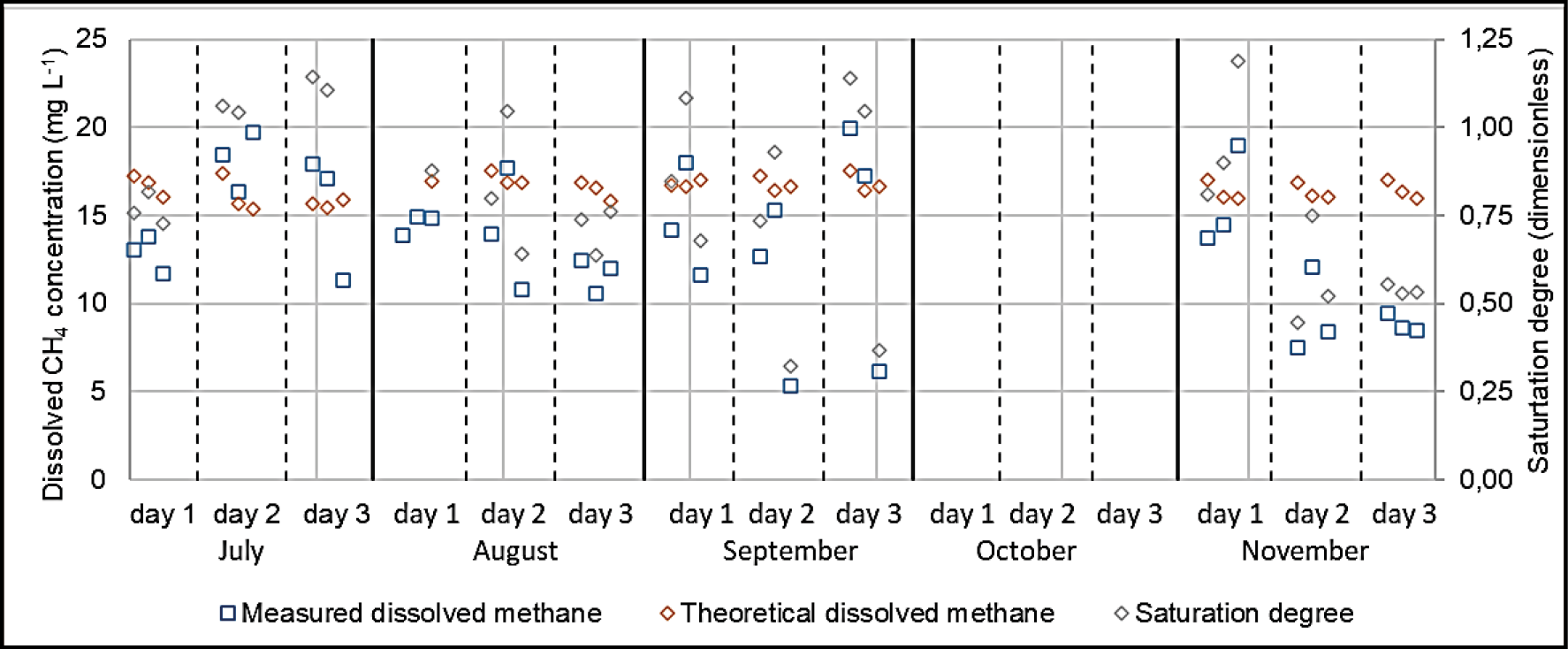 The average concentration of dissolved methane in the effluent was 13.40 ± 3.85 mg L-¹, representing a loss of 43%. The theoretical concentrations of dissolved methane, calculated using Henry’s Law, showed little variation, resulting in oscillations in the saturation degree (0.32 to 1.28) that generally followed the trends of the experimentally measured concentrations.