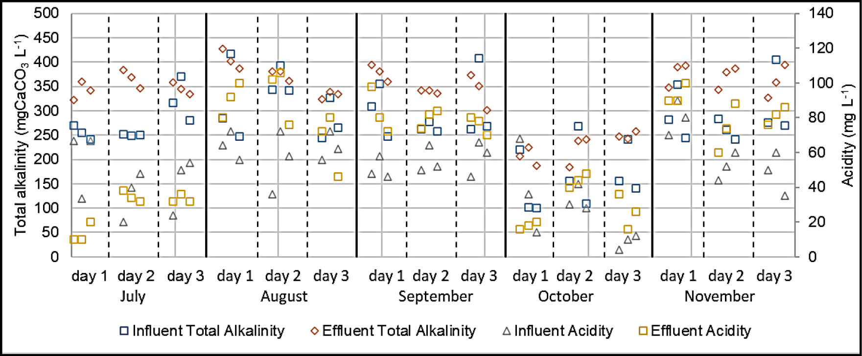 Figure 2 – Influent and effluent pH and temperature (a); alkalinity and acidity (b); BOD (c); COD (d); TSS (e); and VSS (f) measured over the monitoring period