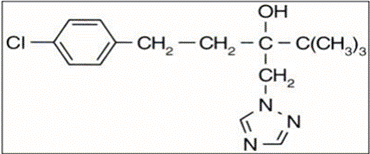 O Tebuconazol (RS) -1-p-chlorophenyl-4,4-dimethyl-3- (1H-1,2,4-triazol-1-ylmethyl) pentan-3-ol (Figura 3) é um fungicida da família dos triazóis, de ação rápida e proeminente atividade sistêmica, apresenta sua fórmula bruta C16H22ClN3O, a sua composição tebuconazol é de 20% m/v (200 g/L) e ingredientes inertes 80% m/v (800 g/L), o tipo de formulação é concentrado emulsionável, apresenta estado físico líquido de cor amarelo translúcido, com pH 6,12 e a 250C densidade 1,0612 g/cm3 a 200C, com viscosidade 99mPa.s. (20 0C) e solubilidade miscível em água, acetona e etanol (CASTRO, 2017).