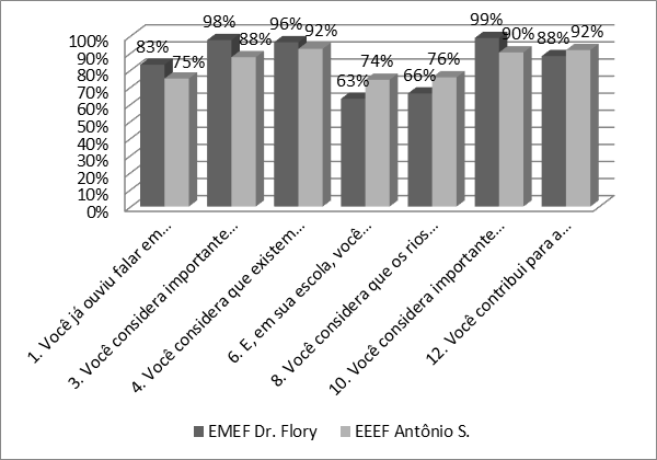 Na questão 1, perguntou-se aos estudantes se já conheciam o termo Educação Ambiental, no qual, deveriam responder “Sim” ou “Não”. Na escola EMEF Dr. Flory Druck Kruel 83% (n=133) dos alunos já conheciam o tema Educação Ambiental e apenas 17% (n=26) não conheciam o tema. Na escola EEEF Antônio Silveira 75% (n=108) dos alunos conheciam o tema e 25% (n=36) alunos entrevistados não (Figura 1).
