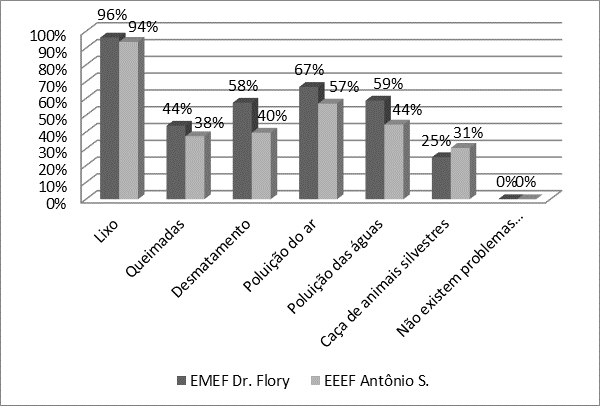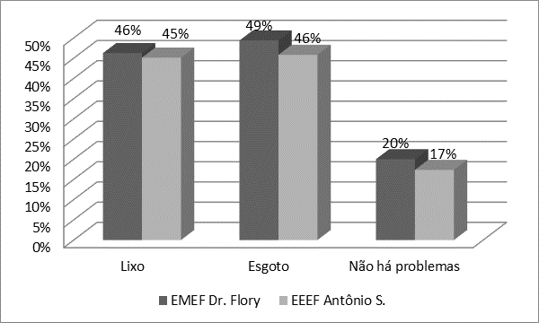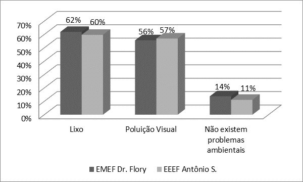 Na EMEF Dr. Flory Druck Kruel, 62% (n=99) dos alunos consideraram que existem problemas com o lixo, 56% (n=89) problema com a poluição visual e 14% (n=22) afirmou que não existem problemas ambientais. Na EEEF Antônio Silveira, 60% (n=86) consideraram que existem problemas com o lixo, 57% (n=82) problema com a poluição visual no ambiente escolar e 11% (n=16) afirmou que não existem problemas ambientais (Figura 4).