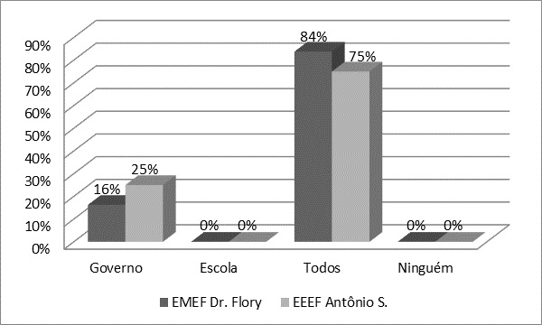 Na EMEF Dr. Flory Druck Kruel, 16% (n=26) afirmaram que a responsabilidade em preservar o meio ambiente é do Governo, nenhum aluno afirmou que a responsabilidade é da escola, 84% (n=134) afirmou que todos nós devemos preservar e nenhum aluno afirmou que ninguém é responsável pelos problemas ambientais. Já na EEEF Antônio Silveira, 25% (n=36) afirmaram que a responsabilidade em preservar o Meio Ambiente é do Governo, nenhum aluno afirmou que a responsabilidade é da escola, 75% (n=108) afirmou que todos nós devemos preservar e nenhum aluno afirmou que ninguém é responsável pelos problemas ambientais (Figura 6).