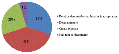 De acordo com a segunda questão (Q2 - Cite os principais impactos ambientais que podem ser identificados nas áreas onde se concentra a exploração de minérios.) verificou-se que a partir das respostas atribuídas pelos entrevistados, existem sérios problemas ambientais em regiões exploradas no município de Frei Martinho. O desmatamento (40%) novamente apareceu como o ponto mais preocupante na região, seguido pelos rejeitos descartados em lugares inapropriados (30%) e cavas expostas (25%) (Figura 3).