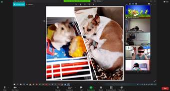 Other useful resources used for engaging students in online learning contexts were screen sharing, background filters, and extensions like Snap Camera. These resources were explored together to further enhance the class thematic topic of discussion. Figure 3 shows an online class in which we are talking about pets, allowing students to develop confidence and build their arguments as they visualize and identify themselves with different multimodal tools used to describe and talk about their pets’ lifestyle and routine, as presented by one of the student’s screen sharing in Figure 3.