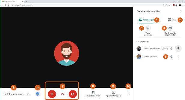 Dependendo do tipo de participante que você for dentro da webconferência (participante comum ou criador da webconferência) alguns ícones da interface podem ficar ocultos ou não. Na imagem abaixo são mostrados por completo todos os ícones de interface da sala de webconferência do Google Meet;