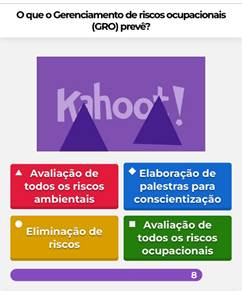 Na etapa 1 o Kahoot! foi utilizado como recurso didático de revisão do conhecimento dos alunos. O Quiz abarcou 20 questões de múltipla escolha acerca dos assuntos: Normas Regulamentadoras - 7 (Programa de Controle Médico de Saúde Ocupacional; 9 (Programa de Prevenção de Riscos Ambientais; e 17 (Ergonomia). A figura 1 apresenta uma das questões, na qual é possível verificar o layout da ferramenta no smartphone. No topo aparece o enunciado, na base inferior as alternativas e o tempo. As equipes tiveram 10 segundos para responder cada questão.