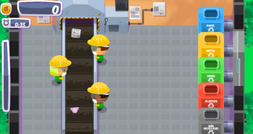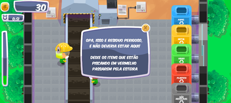 Aqui vemos a simulação de uma usina de triagem de materiais recicláveis, onde são separados os materiais que posteriormente serão reaproveitados, os objetos como: vidros, papéis, metais, plásticos e até mesmo restos de comidas, pilhas e vidros de remédios. Repare que todos esses objetos passam por uma esteira onde o jogador precisa arrastá-los com o mouse, realizando a separação dos mesmos e depositando-os no recipiente correspondente para, assim, realizar a separação correta dos mesmos.