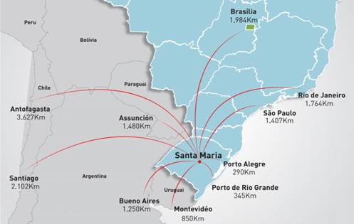 Além disso, a localização geográfica de Santa Maria e sua posição estratégica no Rio Grande do Sul, vinculadas à proximidade com importantes centros urbanos nacionais e internacionais, reforçam essa potencialidade, como demonstrado no Mapa 1. Essa vantagem geoestratégica é benéfica à circulação de bens, informações e pessoas em alta velocidade, elementos que, conforme Virilio (1991), definem o poder e a competitividade de um território.
