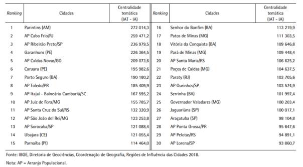Tabela 2 - Cidades com centralidade definida especificamente por deslocamentos para atividades culturais - 2018