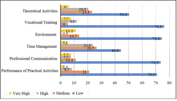 Overall, low stress predominated in all domains, followed by moderate stress. However, it is observed that time management and theoretical activities represent a high level of stress for 23.9% and 20.5% of nursing students. In addition, 11.1% of the students presented very high stress related to the environment.