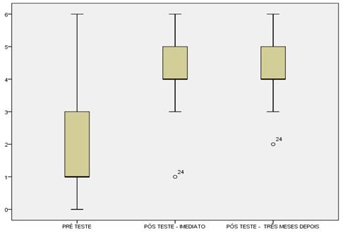Evidenciou-se uma dispersão significativa do número de acertos referentes ao pré-teste em relação ao desempenho identificado no pós-teste imediato a intervenção e depois de três meses. Identificou-se também, a presença de apenas um participante discrepante dos demais, em ambos os momentos de pós-teste, quanto ao desenvolvimento de conhecimento cognitivo, apresentando o menor número de acertos sobre a sepse.