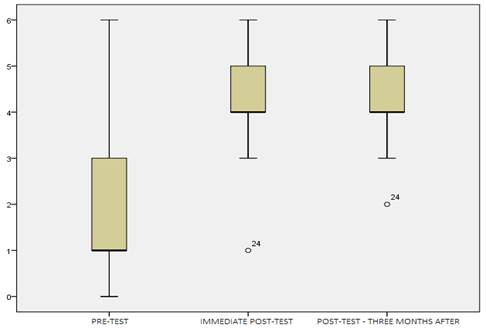 There was a significant dispersion of the number of correct answers regarding the pre-test in relation to the performance identified in the immediate post-test and after three months. Furthermore, there was only one discrepant participant, in both post-test moments, relating to the development of cognitive knowledge, presenting the lowest number of right answers on sepsis.
