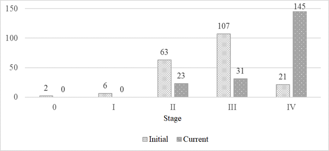 According to the distribution of the stages of the disease, chart 1 shows that, in the initial stage, the moment of the first specialized consultation, 107 women were diagnosed as stage III. There were women in stages 0 and 1, and 21 women were diagnosed in the most advanced stage (IV). The analysis of the current stage, the stage during data collection, showed that 145 women were already in stage IV.