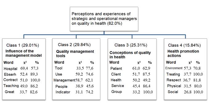 Class 3 was entitled “Conceptions of quality in health” and represented 25.3% of the analyzed corpus. The main words of this class were: “patient”, “client”, “health”, “service”, and “group”. The managers' conception of quality in health is aligned with the idea of quality as a multifactorial element that results from an interprofessional work process, as highlighted in the following statemenst: