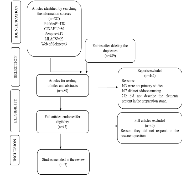 Primary studies published from January 2009 to April 2020 were included. The temporal cut-off is justified by the increase in the use of clinical simulation in nursing in this period and by the advance in scientific research on the simulation phases from 20092,8-9 without language delimitation, published in scientific journals. Literature reviews, editorials, reviews, experience reports, case studies, theoretical reflections, dissertations, theses, monographs and abstracts published in event proceedings were excluded.
