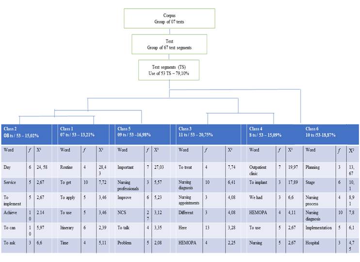 All participants were female, aged between 25 and 58 years old, with graduation experience varying from 3 to 32 years old. Among the participants, only one did not have a postgraduate course and, when questioned about having any training in NCS, three nurses answered that they did not have required training. The data analysis was carried out using the Reinert method, crossing text and word segments, where six classes were found. The corpus was composed by seven texts, with 67 analyzed segments, representing 79.1% of the corpus, according to the dendrogram (Figure 1):