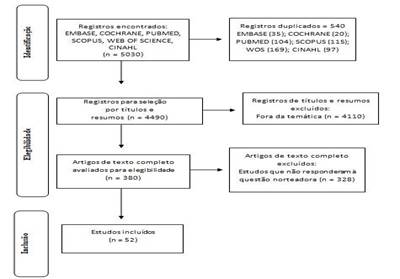 Foram identificados 5.030 estudos e, após a análise de título, resumo e aplicação dos critérios de elegibilidade, foram pré-selecionados 380 para a leitura na íntegra, dos quais 52 foram incluídos na amostra final desta revisão, publicados entre 1989 e 2021 (Figura 2).