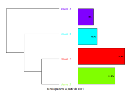 Another analysis performed was the Reinert Method or Descending Hierarchical Classification (DHC). From the segmentation of the textual corpus by classes of text segments and their words, through DHC, the central ideas arising from the participants' answers were evidenced. Thus, the hierarchical analysis retained 476 text segments, classifying 476, thus taking advantage of 100% of these segments, forming four classes, that is, four groupings of text segments that have similar and correlated words. After analysis, the data were organized in a dendrogram (Figure 2) that presents words with associative strength confirmed by the results of the chi-square test (Chi2 ≥ 3, 84), which illustrates the relationships between the classes and the percentage of each of them.