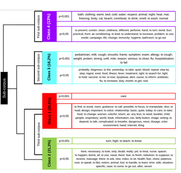 In the same way, class three also gathered a large number of words with greater connection between them. Family members reported the importance of sharing information regarding the timely identification of respiratory conditions, such as pneumonia, in addition to information about allergy caused by milk protein, making these topics essential to compose the booklet.