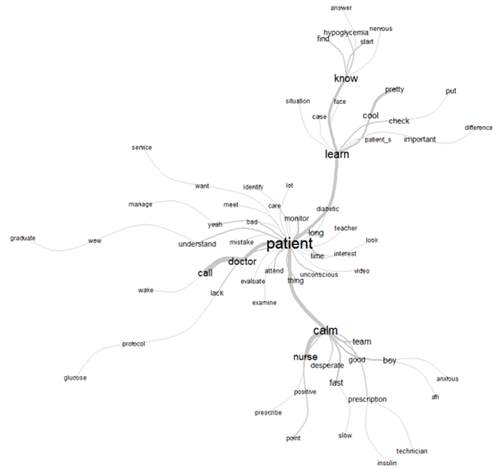 The word "patient" is the central point, with branches that connect to other terms. This centrality may indicate that "patient" is a key term that permeates several discussions or is a starting point for the construction of related ideas and concepts, as observed in the participants' responses.
