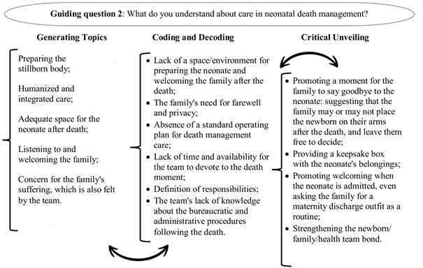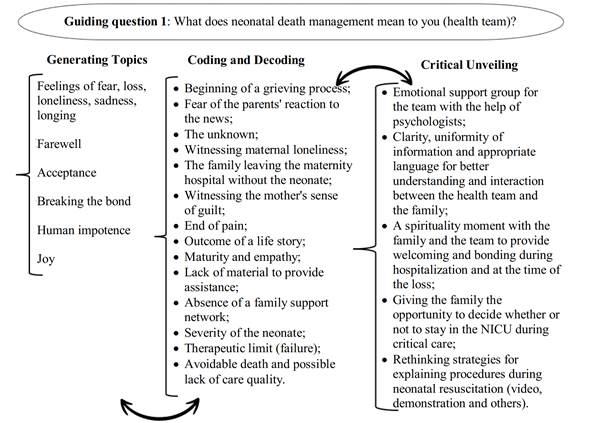 At each meeting, the professionals progressively problematized and reflected on significant dimensions of their realities (generating topics), which contributed to a proactive stance in the face of the limit-situations revealed in their care practices regarding neonatal death management.14