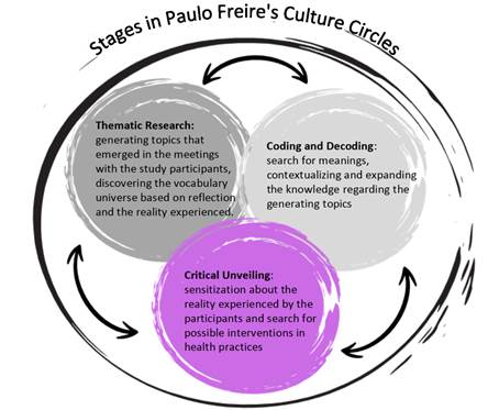 A qualitative and methodological study, with a participatory interface and based on Paulo Freire's Research Itinerary.12-14 This type of research can be developed through different stages consisting of situational diagnosis, literature review, production-construction of the technology, face and content validation by expert judges and pilot testing (evaluation and/or application). However, in order to reach all the stages, continuity research studies are required to ensure the effectiveness and expected impact of a given technological production.12 In this case, as it comes from an MSc thesis, it was possible to reach its production-construction, in complementarity with the methodological strategy proposed by Paulo Freire, carried out through Culture Circles, making up three interdependent stages: Thematic Investigation; Coding and Decoding; and Critical Unveiling, as presented in Figure 1.14