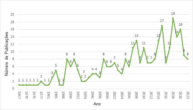 De acordo com os resultados, foram recuperados 293 documentos nas bases de dados, sendo 97 na LILACS, 184 na MEDLINE, seis na Scopus e seis na Web of Science. Tem-se que o primeiro estudo envolvendo a temática foi publicado no ano de 1967, apresentando alta variabilidade de publicações ao longo dos anos, com destaque para o crescimento a partir do ano de 2007, que dispôs de 11 publicações. No mais, desde o ano de 2007 até novembro de 2022, houve 178 estudos publicados, representando o percentual de 60,7%, com pico de produção no ano de 2018 (Gráfico 1).