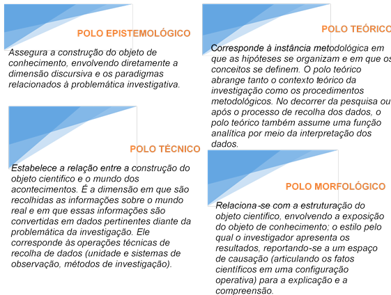 Lessard-Hebert, Goyette, Boutin (1994), que defendem um modelo articulado em quatro polos – epistemológico, teórico, morfológico e técnico – como um sistema interativo constituinte dos processos investigativos, foi nossa lente teórica ao analisarmos o Corpus 1 (DE PAULA; CYRINO, 2018c) especificamente os polos epistemológico e teórico. Apresentamos na Figura 2, uma síntese das principais dimensões de cada um dos quatro polos do processo investigativo.