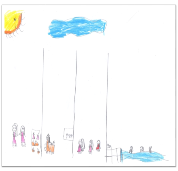 Desenho 2 – Marta, negra, 8 anos. “Eu fazendo compras, no restaurante, brincando de ioiô com minhas amigas e na piscina”.